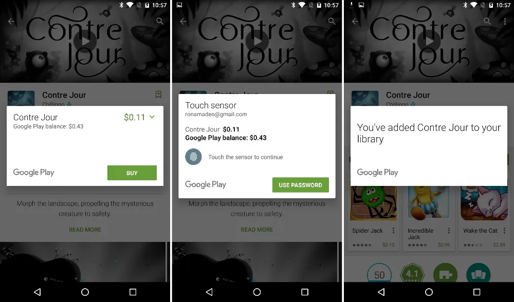 Play 商店是最先支持该 API 的应用之一。你可以使用你的指纹来购买应用,而不用输入你的密码。Nexus 5X 和 6P 是最先支持指纹 API 的手机,手机背面带有指纹读取硬件。