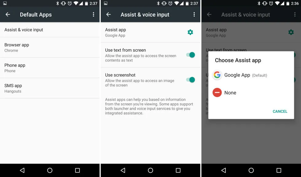 谷歌没有让这成为私有特性,而是给安卓创建了一个全新的“Assistant API(助理 API)”。用户可以挑选一个“助理应用”,它可以在长按 home 键的时候获取很多信息。助理应用会获取所有由当前应用加载的数据——不仅是直接从屏幕获取到的——连同所有这些图片还有任何开发者想要包含的元数据。这个 API 驱动了谷歌 Now on Tap,如果愿意的话,它还允许第三方打造 Now on Tap 的竞争对手。
