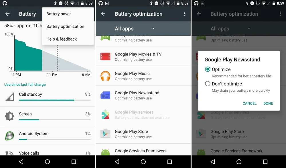 在棉花糖中,谷歌还添加了一个 “Doze(休眠)”模式来在设备闲置的时候节约更多电量。如果设备静止不动,未接入电源,并且屏幕处于关闭状态,它会慢慢进入低功耗离线模式,锁定后台进程。在一段时间之后,网络连接会被禁用。唤醒会被锁定——应用会请求唤醒手机来运行后台进程——而它会被忽略。系统警报(不含用户设置的闹钟)以及任务调度器也会被关闭。