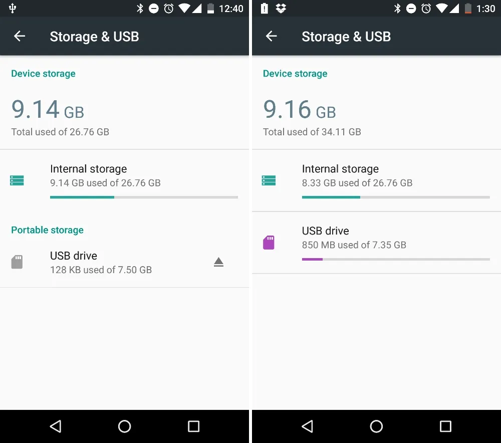 不幸的是实际上可以使用可选存储的设备很长时间都没有出现。Nexus 设备不支持存储卡,所以为了测试我们插上了一个 U 盘作为我们的可选存储。OEM 厂商最初抵制这项功能,LG 和三星都在他们 2016 年初的旗舰机上禁用了它。三星说“我们相信我们的用户需要 microSD 卡是用来在手机和其它设备之间转移数据的”,一旦卡被格式化成 ext4 这就不可能了。