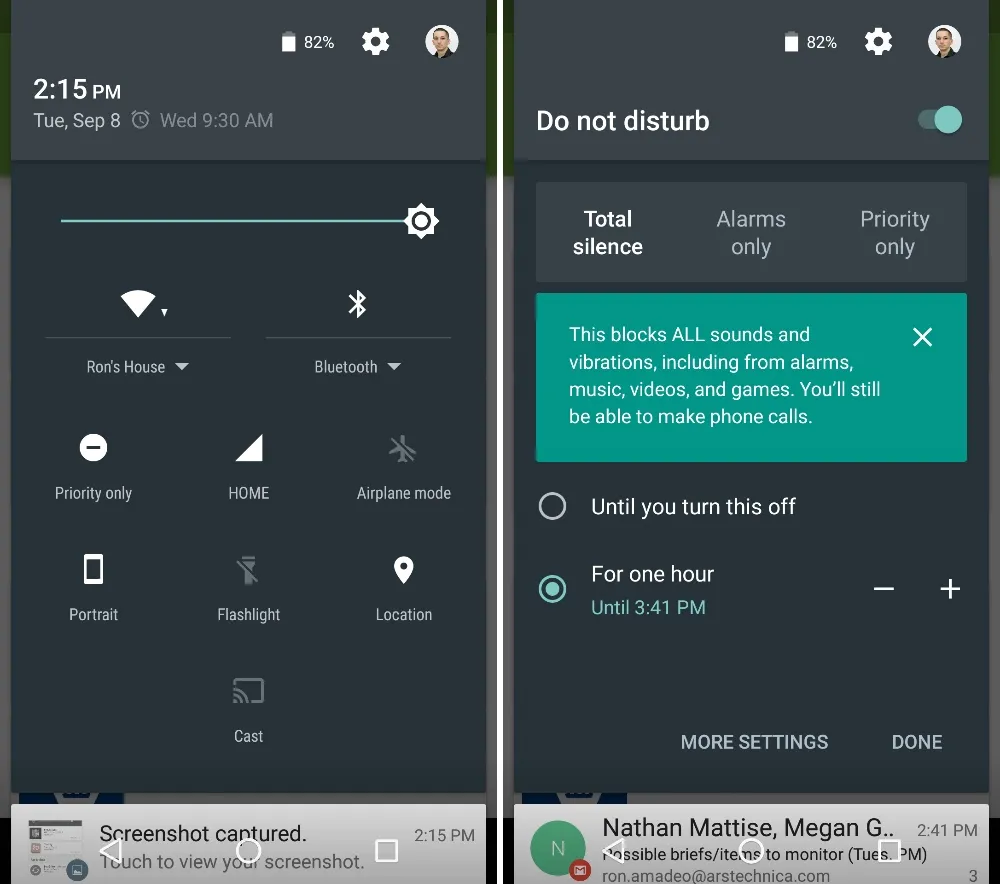 为了更简洁的设计,谷歌将通知优先级控制从音量弹窗中移除了。按下音量键会弹出一个单独的滑动条,对应当前音源控制,还有一个下拉按钮可以展开控制面板,显示所有的三个声音控制条:通知,媒体和闹钟。所有的通知优先级控制还在——它们现在在一个“勿扰模式”的快速设置方块中。