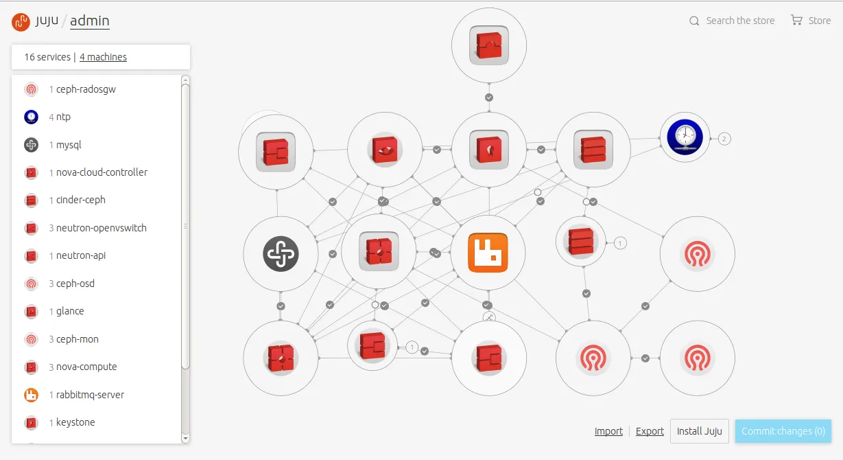 在 Juju 中,软件服务被定义为一种叫做 Charm 的东西。 Charms 是代码片段,它通常用 python 或 bash 编写,其中提供有关服务的信息 – 声明的接口、服务的安装方式、可连接的其他服务等。