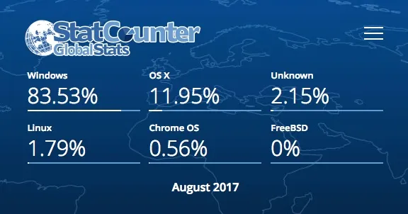 而据另外一家统计公司 StatCounter 的统计数据,Linux 的份额仅有 1% 多点,如果加上 ChromeOS 刚刚过了 2%。