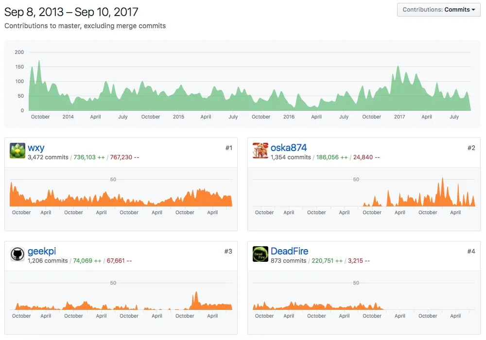 下图是 LCTT TranslateProject 这 4 年间的提交情况: