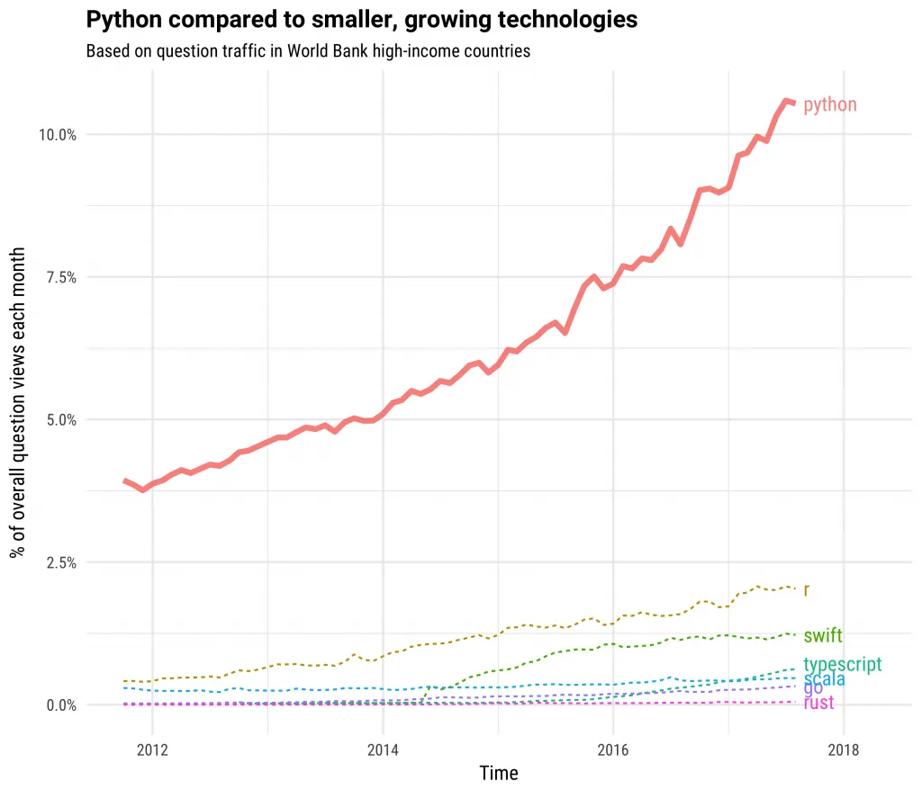 上面的图表中有一个重要的遗漏:去年,有关 TypeScript 的问题流量增长了惊人的 142%,这使得我们需要去除它以避免压扁比例尺。你还可以看到,其他一些较小的语言的增长速度与 Python 类似或更快(例如 R、Go 和 Rust),而且还有许多标签,如 Swift 和 Scala,这些标签也显示出惊人的增长。它们随着时间的流量相比 Python 如何?