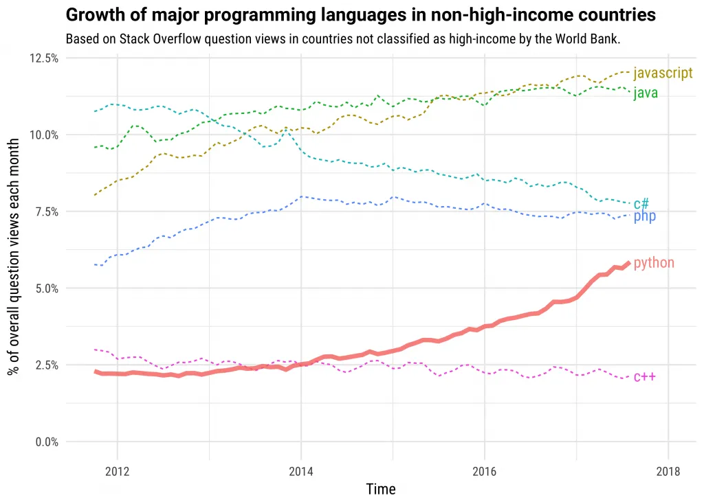这篇文章中讨论的所有数字都是针对高收入国家的。它们一般指的是美国、英国、德国、加拿大等国家的趋势,他们加起来占了 Stack Overflow 大约 64% 的流量。许多其他国家,如印度、巴西、俄罗斯和中国,也为全球软件开发生态系统做出了巨大贡献,尽管我们也将看到 Python 在这方面有所增长,但本文对这些经济体的描述较少。