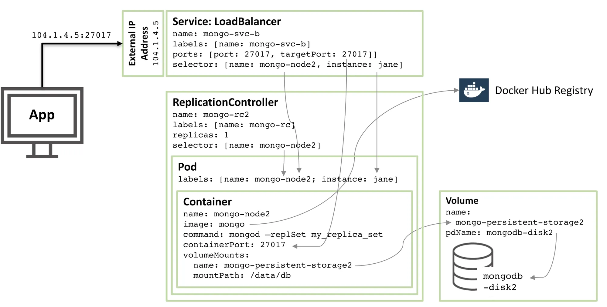 /data/db目录映射到名为mongo-persistent-storage1的永久存储上,这又被映射到在 Google Cloud 中创建的名为mongodb-disk1的磁盘中。这是 MongoDB 存储其数据的地方,这样它可以在容器重新编排后保留。 - 容器保存在一个 pod 中,该 pod 中有标签命名为
