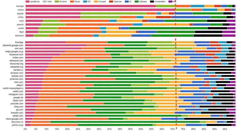 由于传统 JavaScript 基准(包括最新版的 JetStream 和 Octane)可能已经背离其有用性变得越来越远,我们开始在 2016 年初寻找新的方法来测量现实场景的性能,为 V8 和 Chrome 添加了大量新的性能追踪钩子。我们还特意添加一些机制来查看我们在浏览 web 时的时间究竟开销在哪里,例如,是脚本执行、垃圾回收、编译,还是什么地方?而这些调查的结果非常有趣和令人惊讶。从上面的幻灯片可以看出,运行 Octane 花费了 70% 以上的时间去执行 JavaScript 和垃圾回收,而浏览 web 的时候,通常执行 JavaScript 花费的时间不到 30%,垃圾回收占用的时间永远不会超过 5%。在 Octane 中并没有体现出它花费了大量时间来解析和编译。因此,将更多的时间用在优化 JavaScript 执行上将提高你的 Octane 跑分,但不会对加载 youtube.com 有任何积极的影响。事实上,花费更多的时间来优化 JavaScript 执行甚至可能有损你现实场景的性能,因为编译器需要更多的时间,或者你需要跟踪更多的反馈,最终在编译、垃圾回收和 运行时桶 等方面开销了更多的时间。