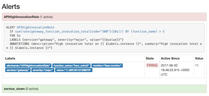 既然使用 Serverless,你也不想花时间监控你的功能。幸运的是,OpenFaaS 内建了 Prometheus 指标检测,这意味着你可以追踪每个功能的运行时长和调用频率。