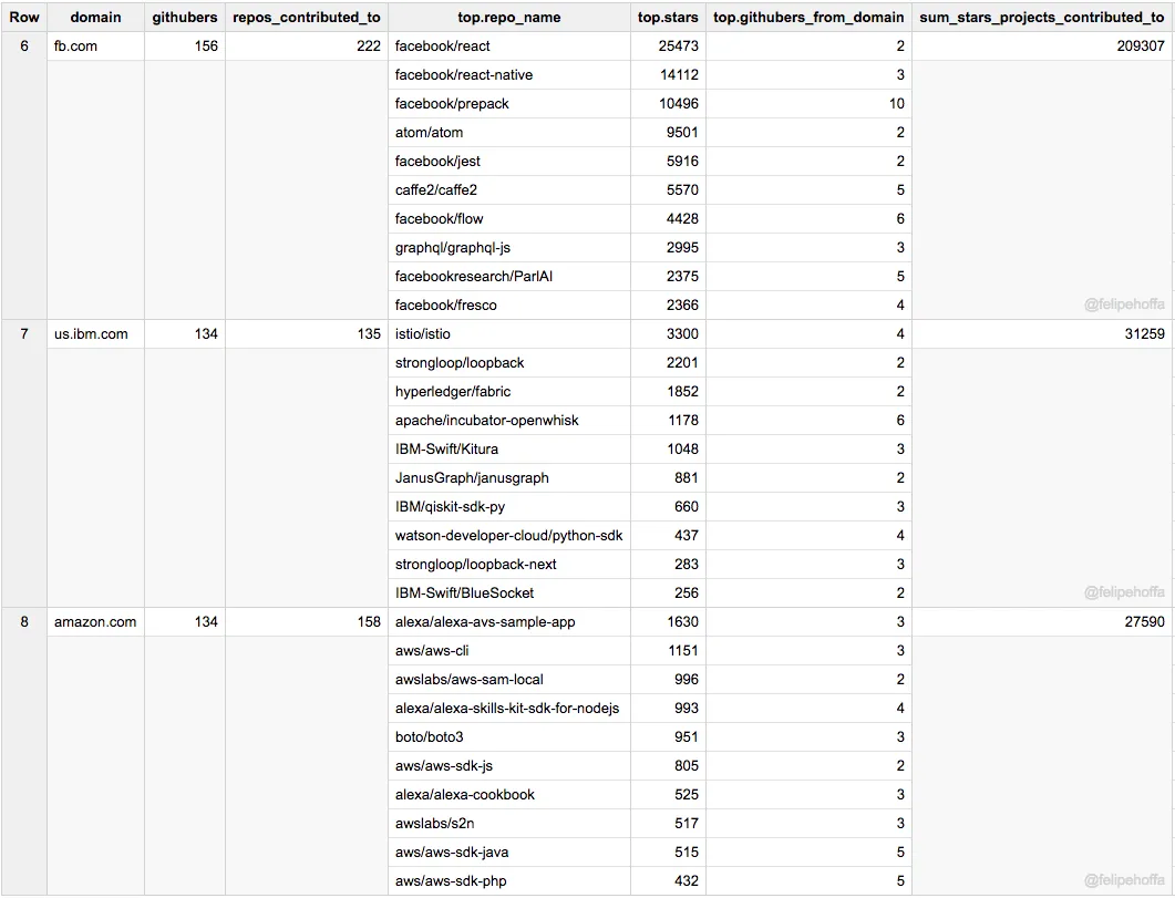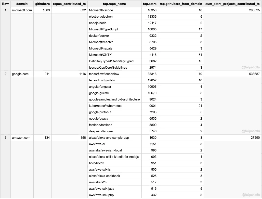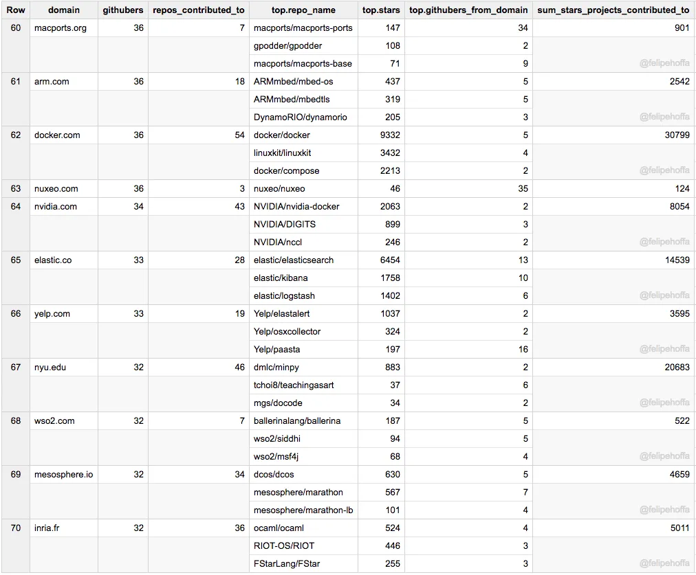 - 不是每个用户都在 GitHub 上使用其组织的邮件。有许多人使用 gmail.com、users.noreply.github.com 和其它邮件托管商的邮件地址。有时候这是为了保持匿名和保护其公司邮箱,但是如果我不能定位其公司域名,这些用户我就不会统计。抱歉。