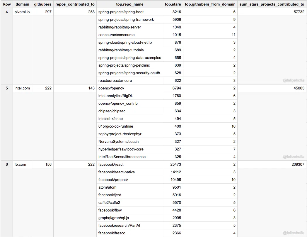 如果说亚马逊看起来被微软和谷歌远远抛在了身后,那么这之间还有哪些公司呢?根据这个排名来看,红帽、Pivotal 和英特尔在 GitHub 上做出了巨大贡献: