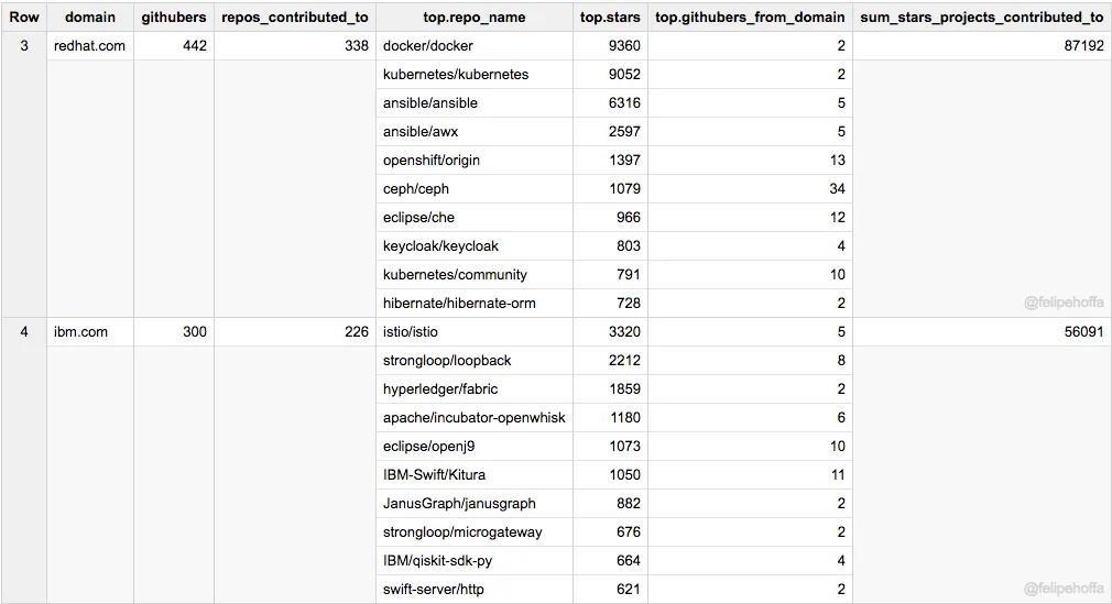 在 GitHub 上判定每个用户所属的公司并不容易,但是我们可以使用其推送事件的提交消息中展示的邮件地址域名来判断。