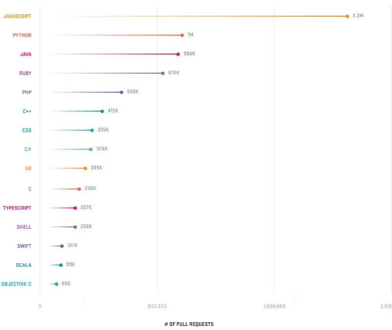 通过 PR 所使用的语言,可以发现最流行的语言是——JavaScript!而 Python 取代了 Java 成为了第二名。很高兴 Ruby 和 PHP 分别能取得第四、第五名。其余的名次和去年相差不大。