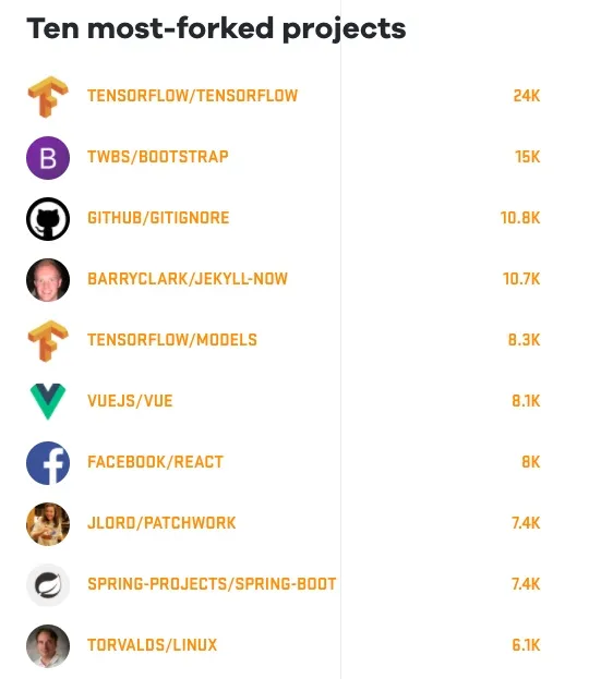 从这些活跃的仓库中,我们找出了 10 大 复刻 数最多的仓库。人工智能方向的 TensorFlow 项目夺得桂冠,前端方向的 BootStrap 是第二。尤雨溪的 vuejs 排名第六,恰恰比排名第七的 Facebook 的 react 的复刻数高一点,很难说这与今年 Facebook 对 react 的许可证问题有没有关系。而 Linus 的 Linux 项目敬陪末座,作为这样庞大的一个项目,已经相当了不起了。