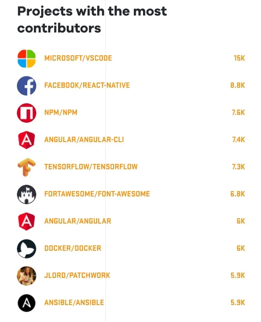 而以贡献者来说,微软的 vscode 项目的贡献者最多,几乎是排在第二名的 react-native 的两倍。这一方面证明了社区对 vscode 的喜爱,另外一方面也证明了微软在开源方面的重注投入。
