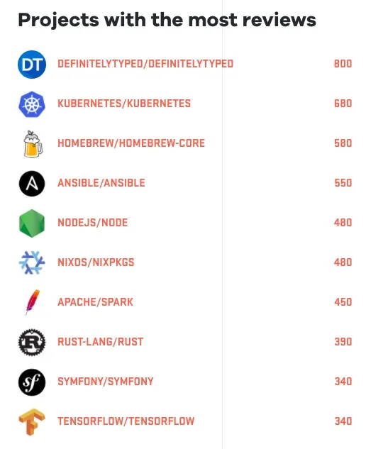 得到最多代码评议的项目是 Typescript 的一个类型定义库 DefinitelyTyped,第二名才是炙手可热的 Kubernetes。