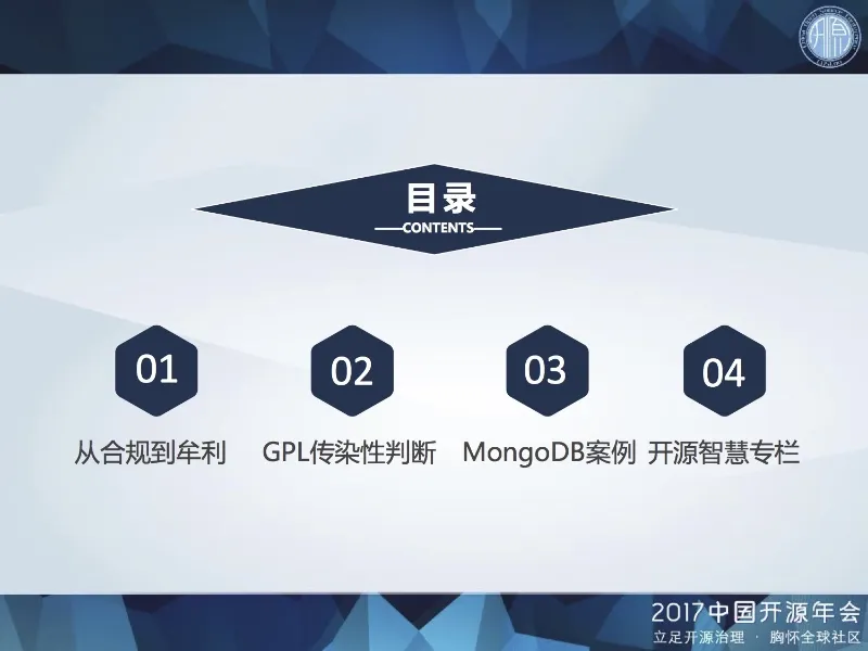 演讲内容主要包括四个部分,第一部分为“从合规到牟利”,简要介绍目前开源软件合规环境的变化情况。第二部分为“ GPL 传染性判断”,介绍从实务角度考虑,GPL 传染性判断的流程、方法和原则。第三部分为“MongoDB 案例”,介绍了采用 AGPL 许可证的 MongoDB 案例。第四部分为“开源智慧专栏”,简单介绍集慧智佳与 Linux 中国合作开办的“开源智慧专栏”。