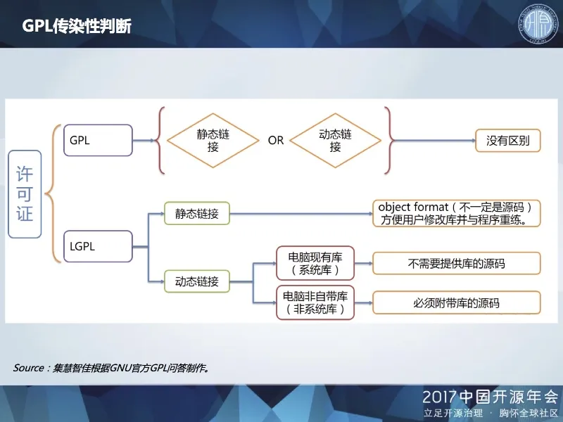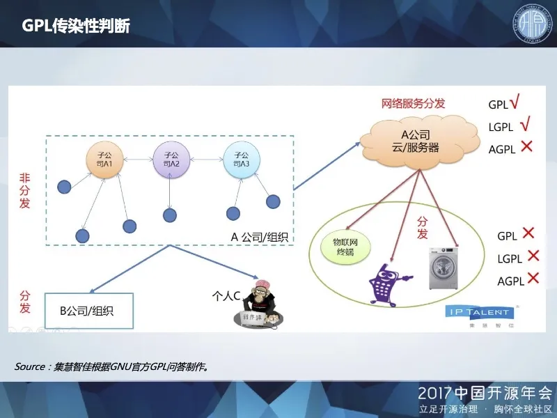 2017 年 11 月 18 日至 19 日,2017 中国开源年会在上海交大召开,来自集慧智佳的高级咨询师薛亮在开源治理分论坛上发表了题为《ABC 时代 GPL 许可证传染性问题探讨》的演讲,现将演讲的内容进行整理和补充,以飨读者。
