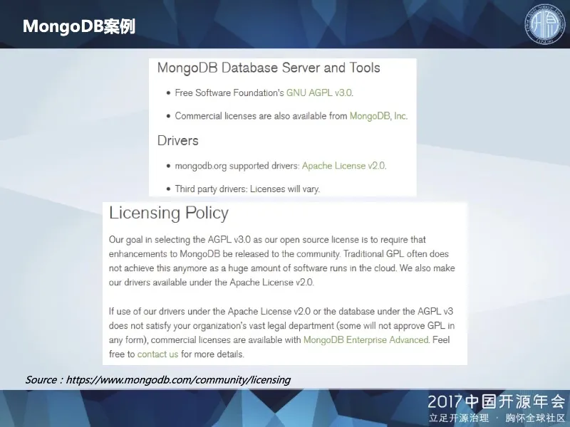 具体看一下 MongoDB 的许可政策。MongoDB 的数据库部分采用严格的 AGPL v3.0 许可证,并且是双重许可,用户既可以选择开源版本,也可以选择商业授权版本。MongoDB 的驱动部分则采用宽松的 Apache v2.0 许可证。