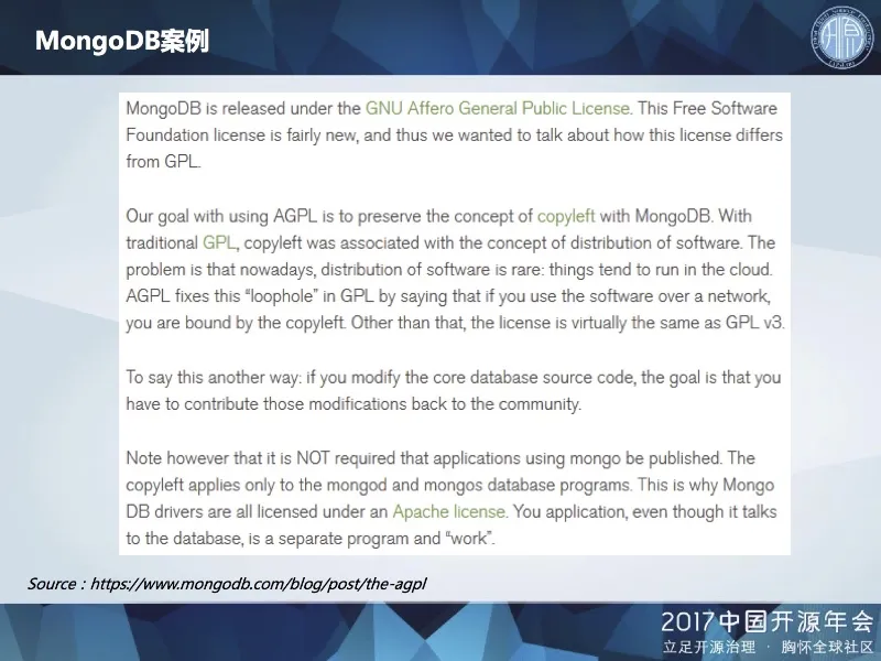 第三部分我们来看一个案例,MongoDB 是一个非常典型的使用 AGPL 许可证的开源软件。国外有文章甚至开玩笑说,正是因为有了 MongoDB,人们对 AGPL 许可证的看法有了明显改变,从 “never use AGPL” 转变成 “never use AGPL except for Mongo DB”。
