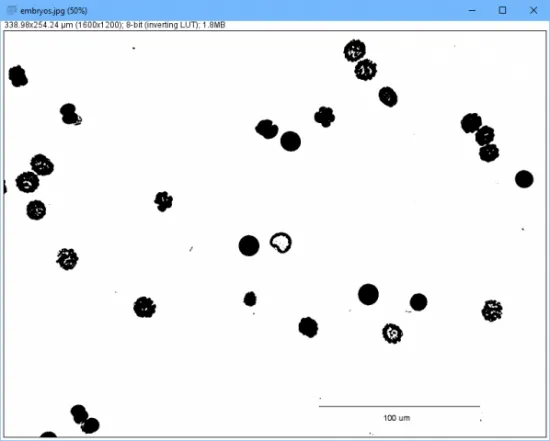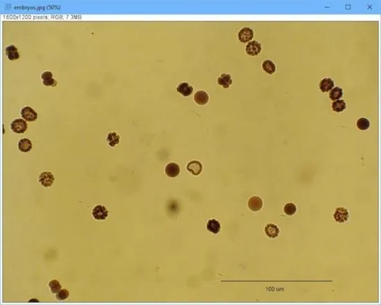 那么,现在,用 Fiji/ImageJ 可以做什么呢?举一例,统计图片中的物品数。你可以通过点击“File”->“Open Samples”->“Embryos”来载入示例。