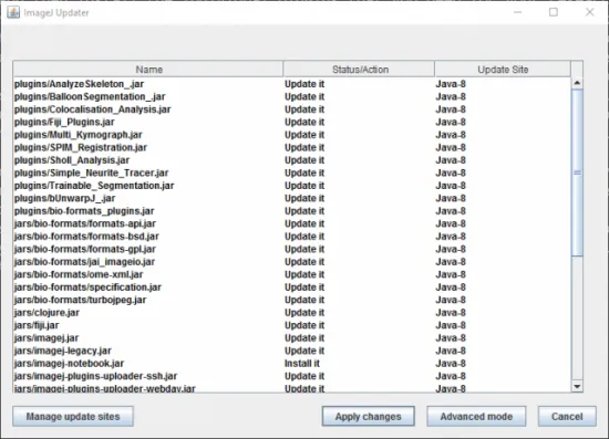 所有已安装的插件都在“插件”菜单项中可选。一旦你安装了很多插件,列表会变得冗杂,所以需要精简你选择的插件。你想手动更新的话,点击“Help”->“Update Fiji” 菜单项强制检测并获取可用更新的列表(图 3)。