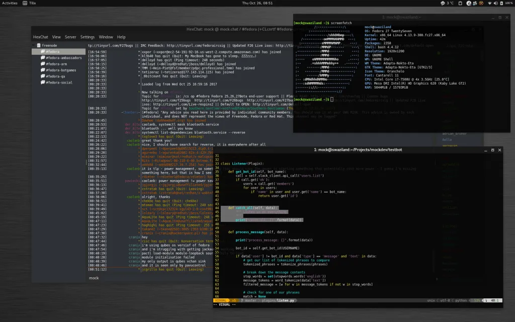 “我从来都不是 IDE 粉,所以大多数的编辑任务都是在 vim 上完成的。”Mark 偶尔也会打开一个简单的文本编辑器,如 gedit,或者 xed。他用 GPaste 做复制和粘贴工作。“对于终端的选择,我已经变成 Tilix 的忠粉。”McIntyre 通过 Rhythmbox 来管理他喜欢的播客,并用 Epiphany 实现快速网络查询。