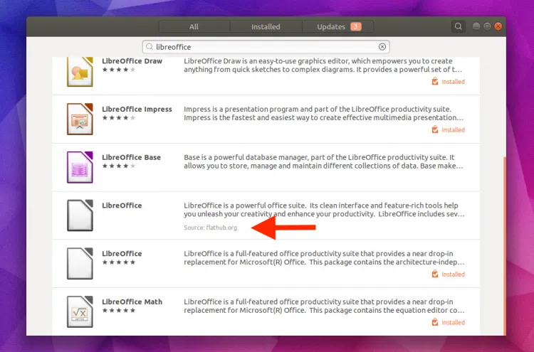 在本例中,搜索 “LibreOffice” 并在结果中找到下面有 Flathub 提示的结果。(请记住,Ubuntu 已经调整了客户端,来将 Snap 程序显示在最上面,所以你可能需要向下滚动列表来查看它)。