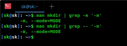 这个命令会显示出 mkdir 命令 man 页中第一次出现 -m 时的内容。从上面命令中我们可以看到 -m 表示的是 “MODE”(chmod)。