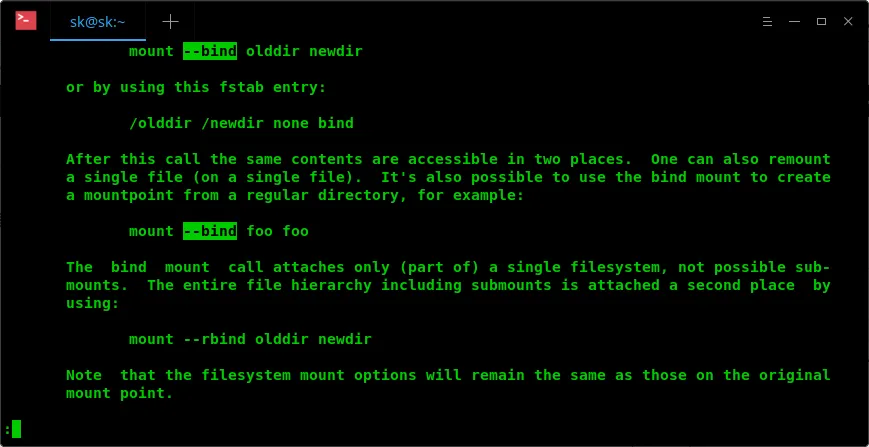 假设你正在查看 mount 命令的 man 页,想要寻找关于 -bind 选项的相关信息。可以输入:
