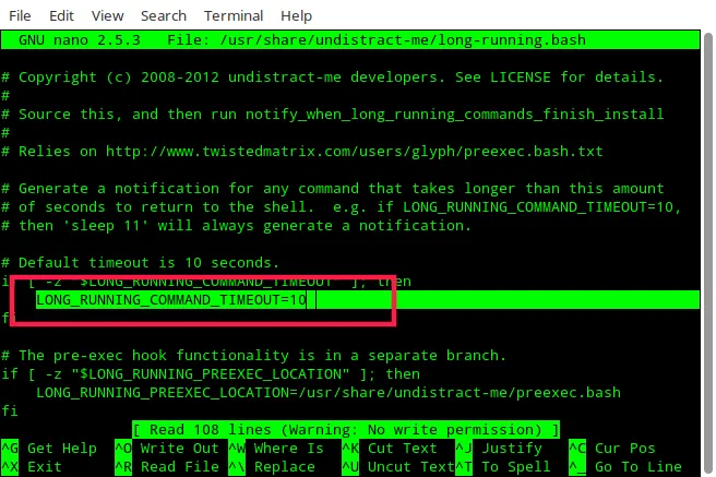 默认情况下,Undistract-me 会将任何超过 10 秒的命令视为长时间运行的命令。你可以通过编辑 /usr/share/undistract-me/long-running.bash 来更改此时间间隔。