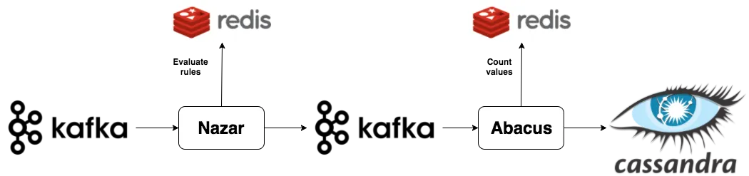 从这里,浏览计数系统有两个按顺序运行的组件。我们的计数架构的第一部分是一个名为 Nazar 的 Kafka 消费者,它将读取来自 Kafka 的每个事件,并通过我们编制的一组规则来确定是否应该计算一个事件。我们给它起了这个名字是因为 Nazar 是一个保护你免受邪恶的眼形护身符,Nazar 系统是一个“眼睛”,它可以保护我们免受不良因素的影响。Nazar 使用 Redis 保持状态,并跟踪不应计算浏览的潜在原因。我们可能无法统计事件的一个原因是,由于同一用户在短时间内重复浏览的结果。Nazar 接着将改变事件,添加一个布尔标志表明是否应该被计数,然后再发回 Kafka 事件。