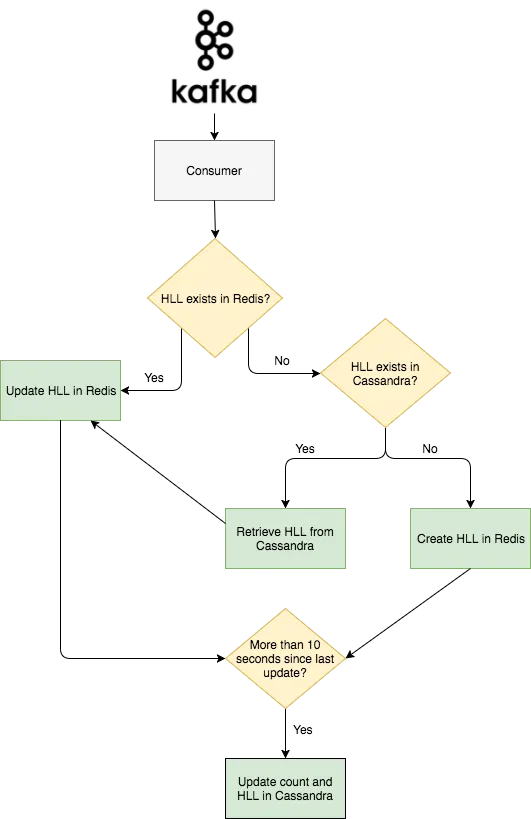 为了保持对可能从 Redis 删除的旧帖子的维护,Abacus 定期将 Redis 的完整 HLL 过滤器以及每个帖子的计数记录到 Cassandra 集群中。 Cassandra 的写入以 10 秒一组分批写入,以避免超载。下面是一个高层的事件流程图。