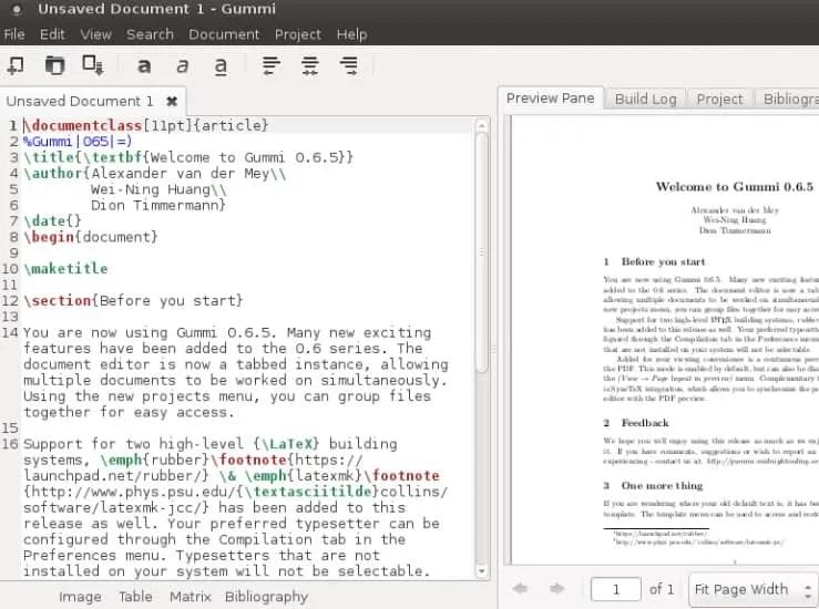 Gummi 是一个非常简单的 LaTeX 编辑器,它基于 GTK+ 工具箱。当然,在这个编辑器中你找不到许多华丽的选项,但如果你只想能够立刻着手写作, 那么 Gummi 便是我们给你的推荐。它支持将文档输出为 PDF 格式,支持语法高亮,并帮助你进行某些基础的错误检查。尽管在 GitHub 上它已经不再被活跃地维护,但它仍然工作地很好。