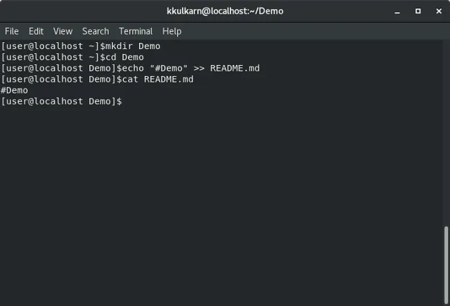 创建一个名为 README.md 的文件,并写入 #Demo。检查文件是否创建成功,请输入: