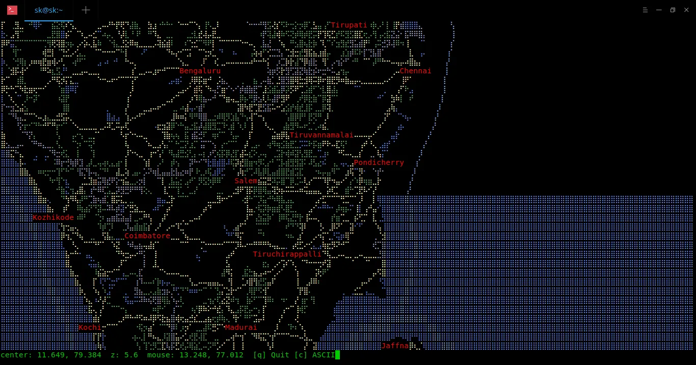 我偶然发现了一个有趣的工具。在终端里的世界地图!是的,这太酷了。给 MapSCII 打 call,这是可在 xterm 兼容终端上渲染的布莱叶盲文和 ASCII 世界地图。它支持 GNU/Linux、Mac OS 和 Windows。我原以为它只不过是一个在 GitHub 上托管的项目而已,但是我错了!他们做的事令人印象深刻。我们可以使用我们的鼠标指针在世界地图的任何地方拖拽放大和缩小。其他显著的特性是: