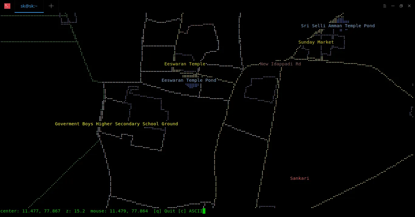 即使它只是一个最小的城镇,MapSCII 也能准确地显示出来。 MapSCII 使用 OpenStreetMap 来收集数据。