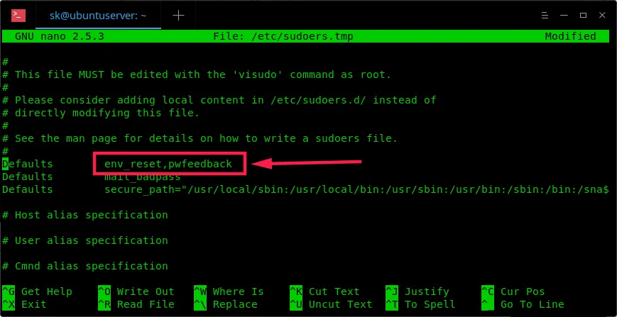 在该行的末尾添加一个额外的单词 ,pwfeedback,如下所示。