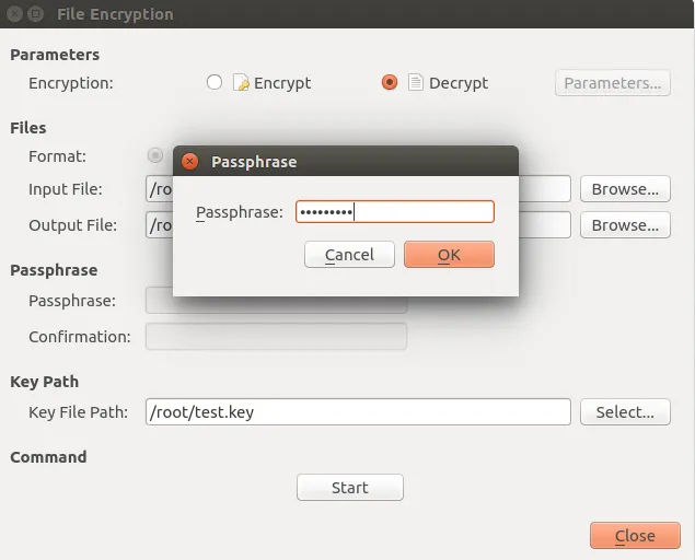 如果你想解密被加密后的文件,打开 EncryptPad ,点击 “File Encryption” ,选择 “Decryption” 操作,提供加密文件的位置和你要保存输出的解密文件的位置,然后提供密钥文件地址,点击 “Start” 按钮,它将要求你输入密码,输入你先前加密使用的密码,点击 “OK” 按钮开始解密过程。当该过程成功完成,你会看到 “File has been decrypted successfully” 的消息 。