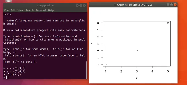 R 提供了一些很棒的演示例子,可以通过在提示符处输入 demo() 从控制台访问。demo(plotmath) 和 demo(perspective) 选项为 R 强大的功能提供了很好的例证。我尝试过一些简单的 vectors 并在 R 控制台的命令行中绘制,如下所示。