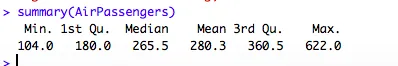 数据导入后,我使用 summary(AirPassengers) 命令获取数据的一些初始描述性统计信息。按回车键后,我得到了 1949-1960 年的每月航空公司旅客的摘要以及其他数据,包括飞机乘客数量的最小值、最大值、四分之一位数、四分之三位数、中位数以及平均数。