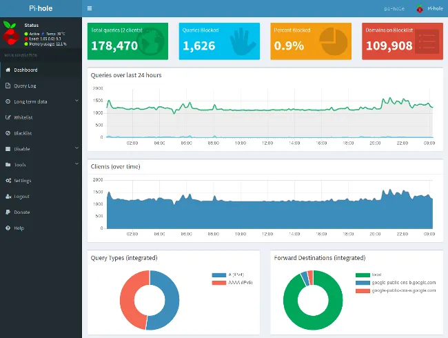 Pi-hole 拦截了超过 100,000 个提供广告的域名,它可以拦截任何设备(包括移动设备、平板电脑、以及个人电脑)上的广告,并且它是完整的拦截了广告,而不是仅将它们隐藏起来,这样做可以提升总体的网络性能(因为广告不需要下载)。你可以在一个 web 界面上、或者也可以使用一个 API 来监视性能和统计数据。