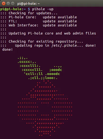 个别情况下,你可能需要去升级你的 Pi-hole 安装。当软件需要更新时,这个 web 界面会出现一个更新提示。如果你启用了 SSH,你可以远程登入,否则,那你只能再次连接键盘和显示器。远程登入之后,输入 pihole -up命令来更新它。
