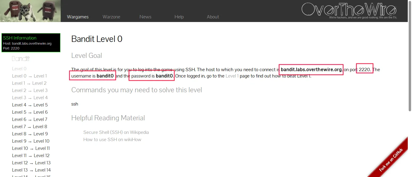 例如,让我们来玩 Bandit 游戏吧。为此,单击 Wargames 主页上的 Bandit 链接。在左上角,你会看到 Bandit 游戏的 SSH 信息。
