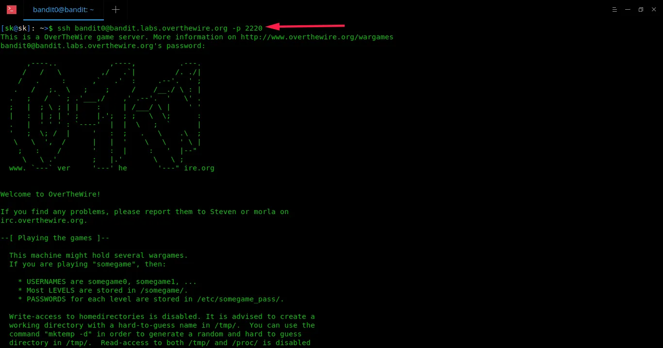 $ ssh bandit0@bandit.labs.overthewire.org -p 2220