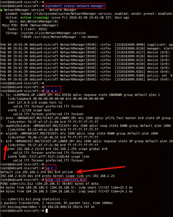 $ ip a s $ ip r $ ping -c 2 cyberciti.biz