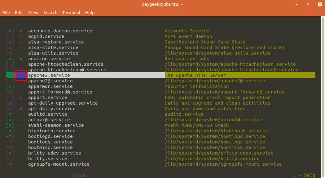 要查看帮助页面,按下 ?。 这将向您显示管理 systemd 服务的可用选项。