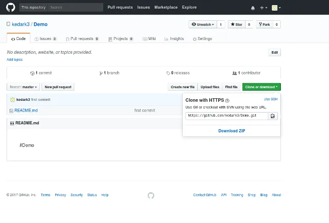 让我们克隆在上一篇文章中创建的名为 Demo 的仓库。(如果你还没有创建 Demo 仓库,请跳回到那篇文章并在继续之前执行那些步骤)要克隆文件,只需打开浏览器并导航到 https://github.com/<your_username>/Demo (其中 <your_username> 是你仓库的名称。例如,我的仓库是 https://github.com/kedark3/Demo)。一旦你导航到该 URL,点击“ 克隆或下载 ”按钮,你的浏览器看起来应该是这样的: