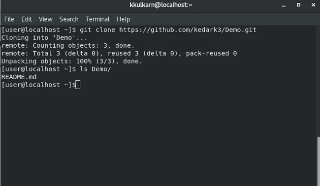 正如你在上面看到的,“ 使用 HTTPS 克隆 ”选项已打开。从该下拉框中复制你的仓库地址(https://github.com/<your_username>/Demo.git),打开终端并输入以下命令将 GitHub 仓库克隆到你的计算机: