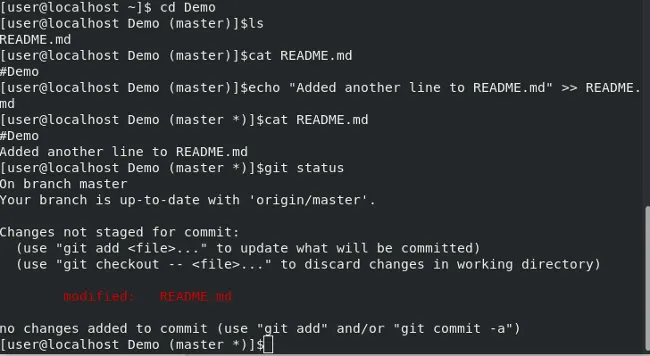 现在我们已经克隆了仓库,让我们修改文件并在 GitHub 上更新它们。首先,逐个输入下面的命令,将目录更改为 Demo/,检查 README.md 中的内容,添加新的(附加的)内容到 README.md,然后使用 git status 检查状态: